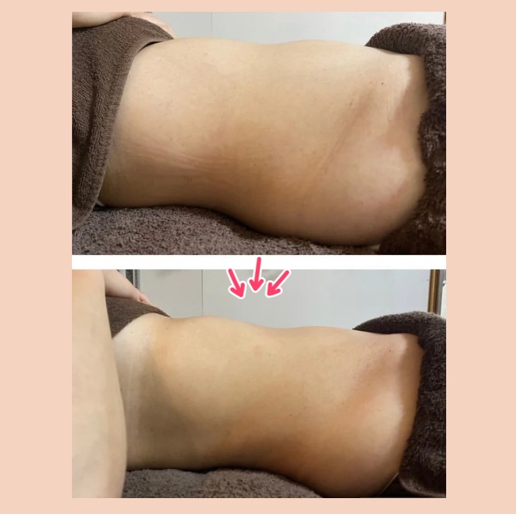 腸整エステとは?腸の蠕動運動を助け、腸の位置を正しい位置に整えることを目的としているおなか周りを中心としたマッサージ・手技で行う施術です。本来、腸はおなかの奥の一定の位置におさまっており、筋肉や靭帯、腹圧によって支えられています。しかし、姿勢の悪さや筋力低下、食生活の乱れなど、さまざまな原因で腸が下がったり、ねじれたりする状態になることがあります。オーナーによる腸を正しい位置へ導く手技で内側から美と健康を整えます。腸を整えることで心も体も整うまさに、「腸もみの進化系」と言えます!腸は副交感神経で動くため、痛みを伴うマッサージは避け、時間をかけて丁寧に行います。女性の7~8割は腸が下がっているとされ、腸を正しい位置へ戻すことで、便秘解消、代謝UP、睡眠の質UP、姿勢改善、冷え・むくみ対策、ボディラインの変化など嬉しい効果が期待されます♪